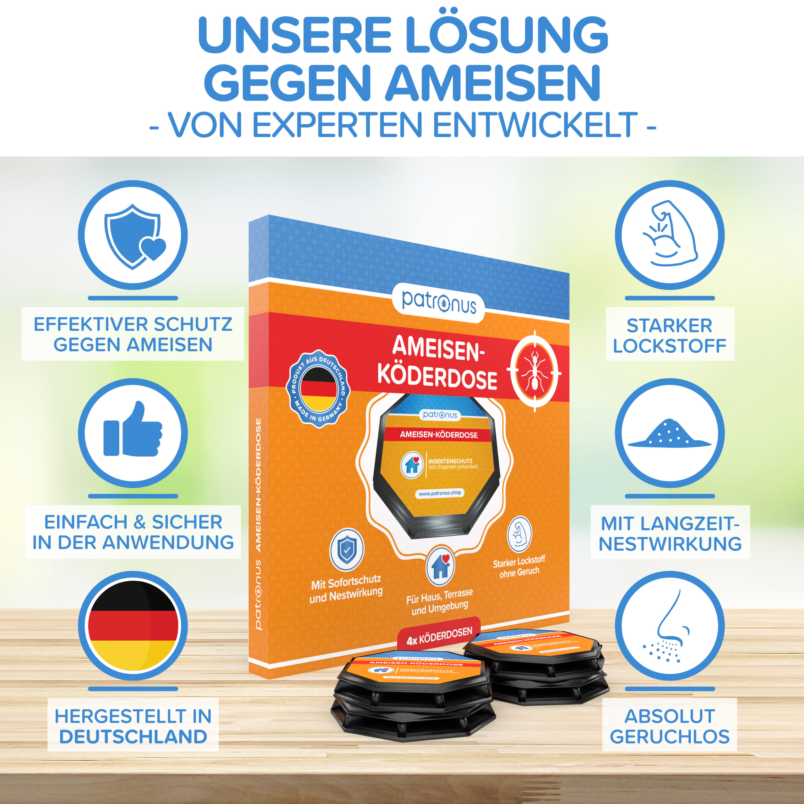Die Ameisen-Köderdose von Patronus ist hier die perfekte Lösung. Dabei spielt es keine Rolle, wo sich die Tierchen aufhalten oder wie stark ausgeprägt der Befall ist. Der effektive Ameisenköder bietet eine Sofort- und Nestwirkung. Das bedeutet, dass die Ameisen von dem starken Lockstoff angelockt werden und den Wirkstoff, den sie in der Ameisen-Köderdose aufnehmen, danach in ihr Nest bringen und an ihre Brut verfüttern. So kannst Du nicht nur die Ameisen loswerden, die in Deiner Wohnung herumlaufen, sondern auch gleichzeitig die Ameisen im Nest bekämpfen, sodass das Problem im Keim erstickt wird.