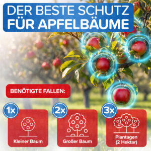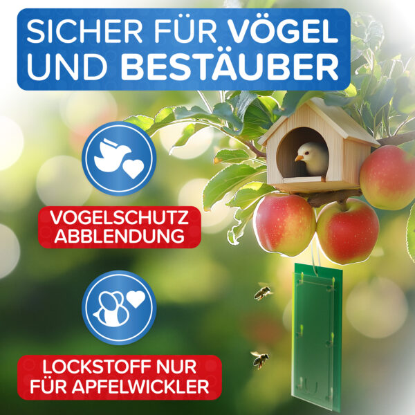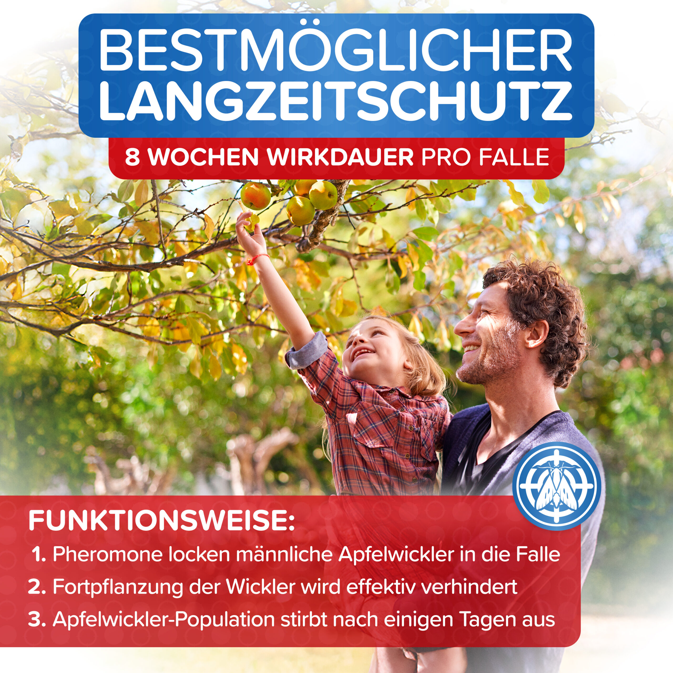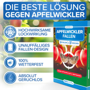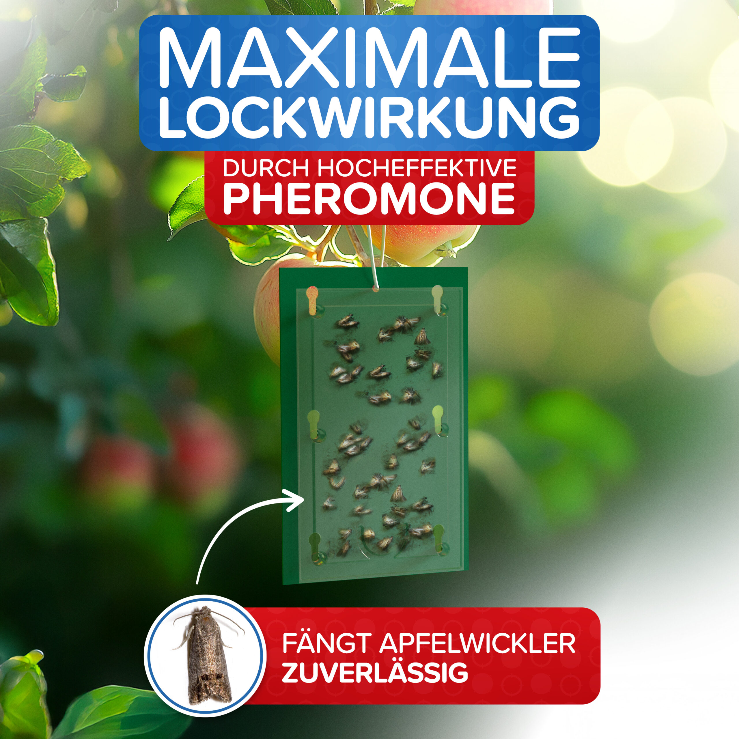 | Rechtlicher Hinweis | Monitoring-Klebefallen sind für den Nachweis von Schädlingen geeignet. Sie sind nicht ausreichend wirksam für die Bekämpfungsmaßnahmen bei einem eindeutigen Befall. Wird ein akuter Befall mit Wicklern festgestellt, muss die Bekämpfung mit geeigneten Mitteln durchgeführt werden. Bitte beachten Sie dazu den Beipackzettel sowie die Tierschutzvorschriften und den Artenschutz in Ihrem Bundesland. |