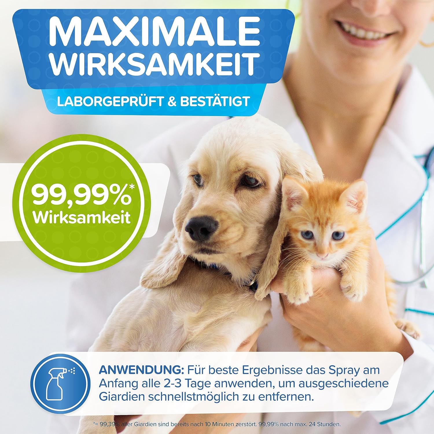 2. Schritt: Aufenthaltsorte, Textilien & Pfoten der Tiere aus ca. 30 cm Entfernung besprühen. Auch der Anus des Hundes kann besprüht werden.