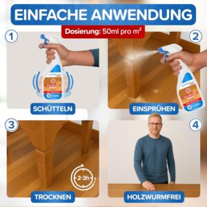 Wichtig: Bei hartnäckigen oder bereits länger andauernden Problemen kann die Anwendung mehrmals pro Woche, bis zum Ausbleiben der Holzwürmer, wiederholt werden.