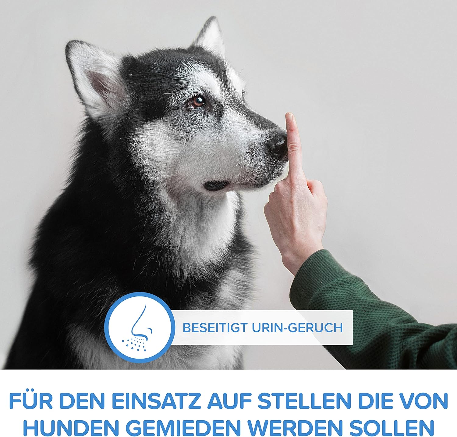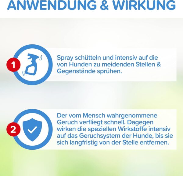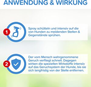 3. Schritt: In hartnäckigen Fällen die Anwendung alle 2-3 Tage wiederholen, bis die Hunde sich langfristig fernhalten Wichtig Info: Der vom Mensch wahrgenommene Geruch verfliegt schnell. Dagegen wirken die speziellen Wirkstoffe intensiv auf das Geruchsystem der Hunde, bis sie sich langfristig von der Stelle entfernen.