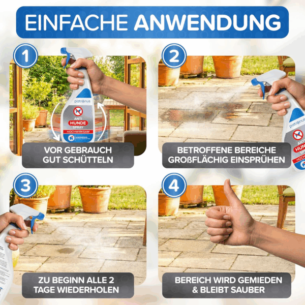 3. Schritt: In hartnäckigen Fällen die Anwendung alle 2-3 Tage wiederholen, bis die Hunde sich langfristig fernhalten Wichtig Info: Der vom Mensch wahrgenommene Geruch verfliegt schnell. Dagegen wirken die speziellen Wirkstoffe intensiv auf das Geruchsystem der Hunde, bis sie sich langfristig von der Stelle entfernen.