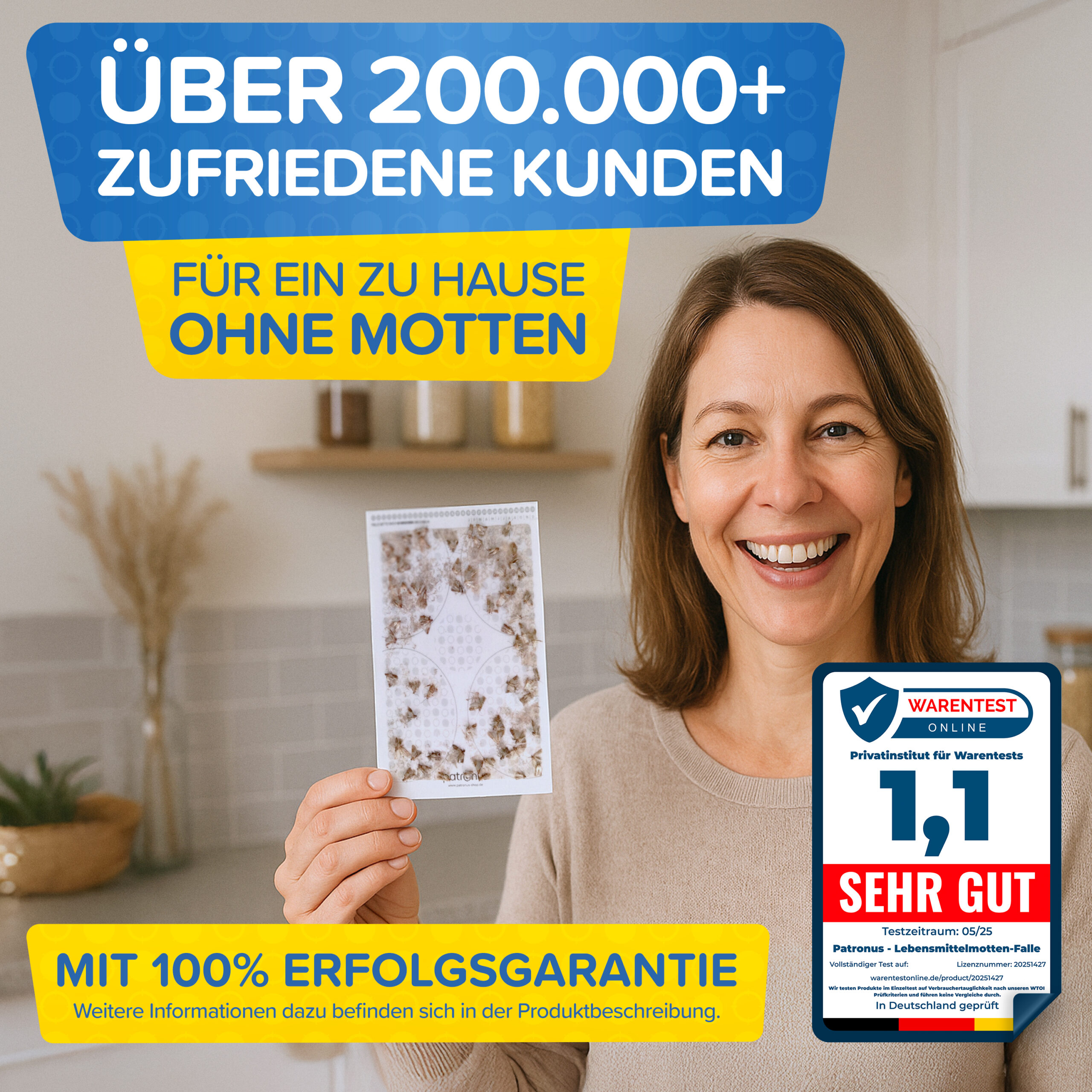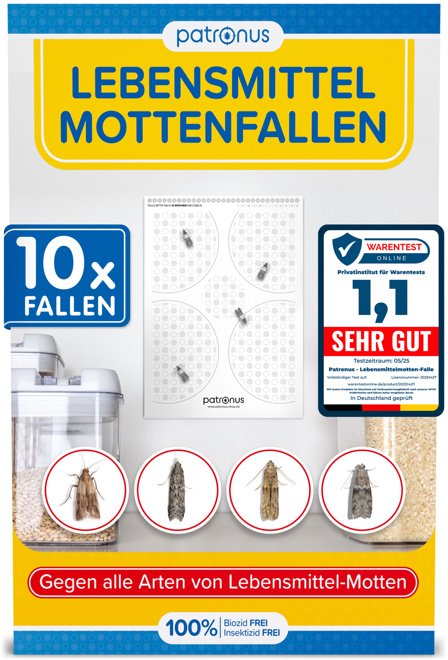 Insgesamt sind Lebensmittelmotten nicht nur eine lästige Plage im Haushalt, sondern können auch negative Auswirkungen auf die Gesundheit und das allgemeine Wohlbefinden haben. Daher ist es wichtig, einen Befall so früh wie möglich einzudämmen und Bekämpfungsmaßnahmen ergreifen. Eine besonders effektive Maßnahme stellen die Lebensmittelmotten-Fallen von Patronus dar. Als Pheromonfallen enthalten sie auf der Klebeseite bzw. der Fallenrückseite einen Sexuallockstoff. Dieser riecht für die männlichen Motten wie das weibliche Pheromon. Mit dieser Methode lockt die Lebensmittelmotten-Falle die männlichen Motten besonders wirksam an. Einmal auf der Falle gelandet, können sich die Motten nicht mehr lösen.