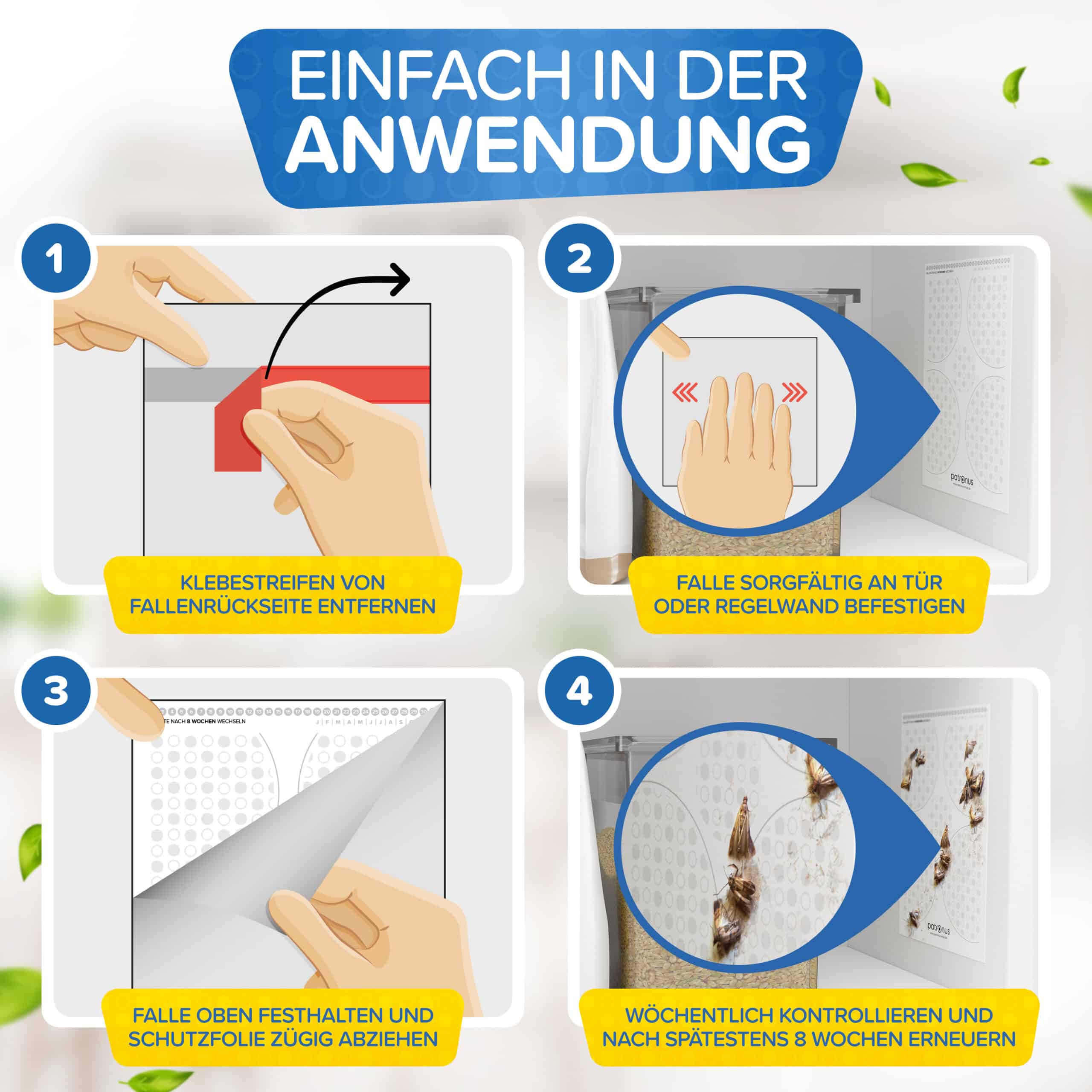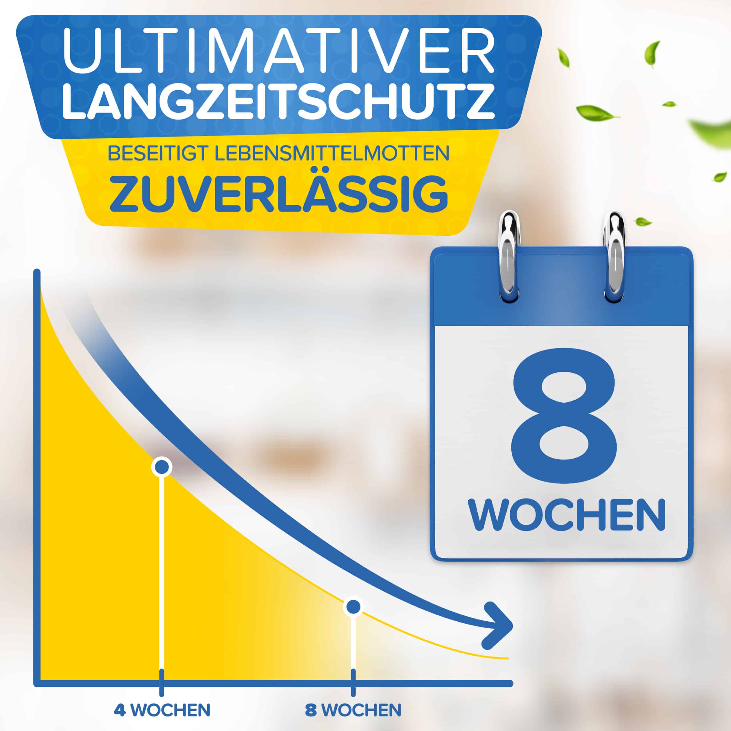 Tipp: Nutze den gesamten Langzeitschutz von bis zu acht Wochen aus und lasse die Lebensmittelmotten-Falle über den Wirkungszeitraum aufgestellt. Überprüfe spätestens alle paar Tage die Klebefläche.