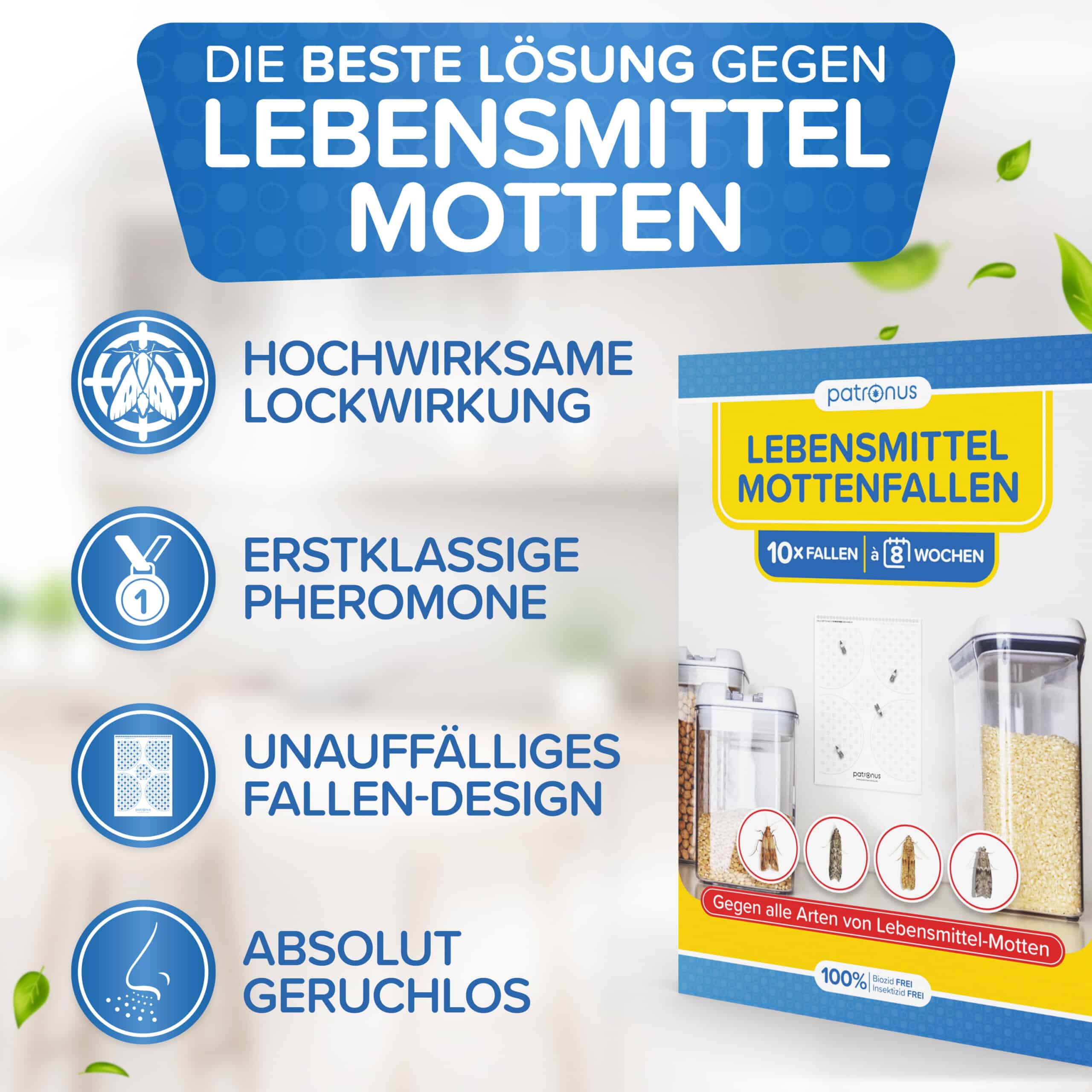 Die Patronus Lebensmittel-Mottenfalle besitzt Pheromone (Sexuallockstoffe) die männliche Motten in die Fallen ziehen. Die FOrtplanzung der Motten wird effektiv verhindert, womit die Mottenpopulation nach wenigen Tagen ausstirbt oder stark minimiert wird.