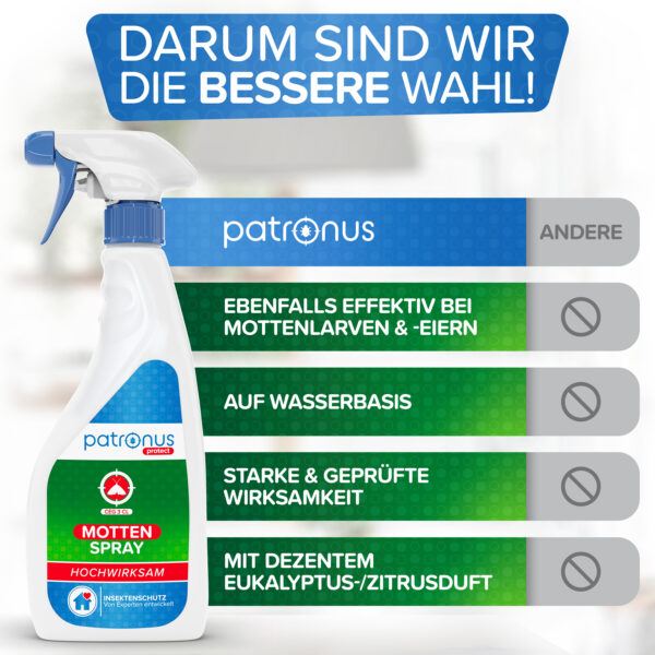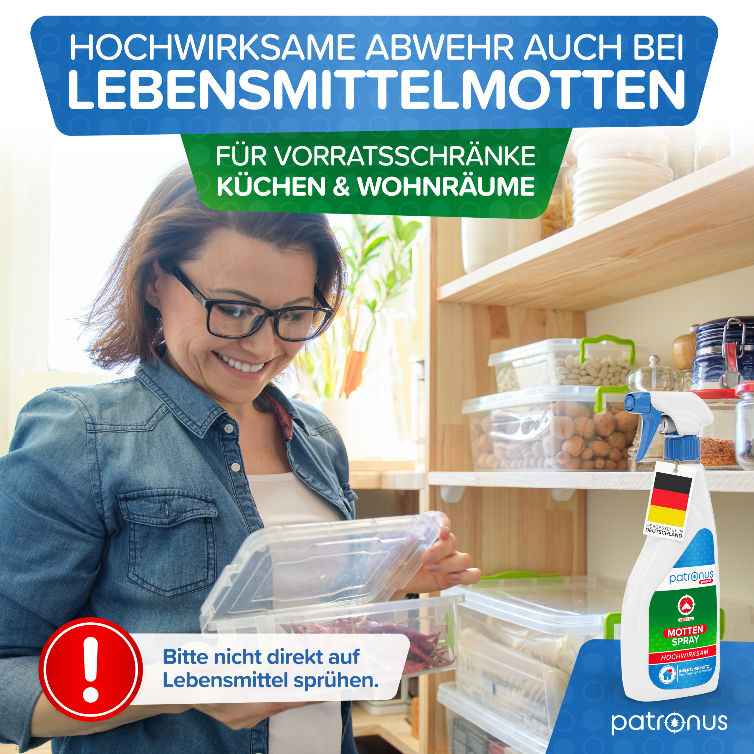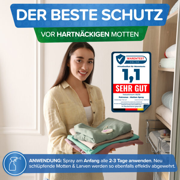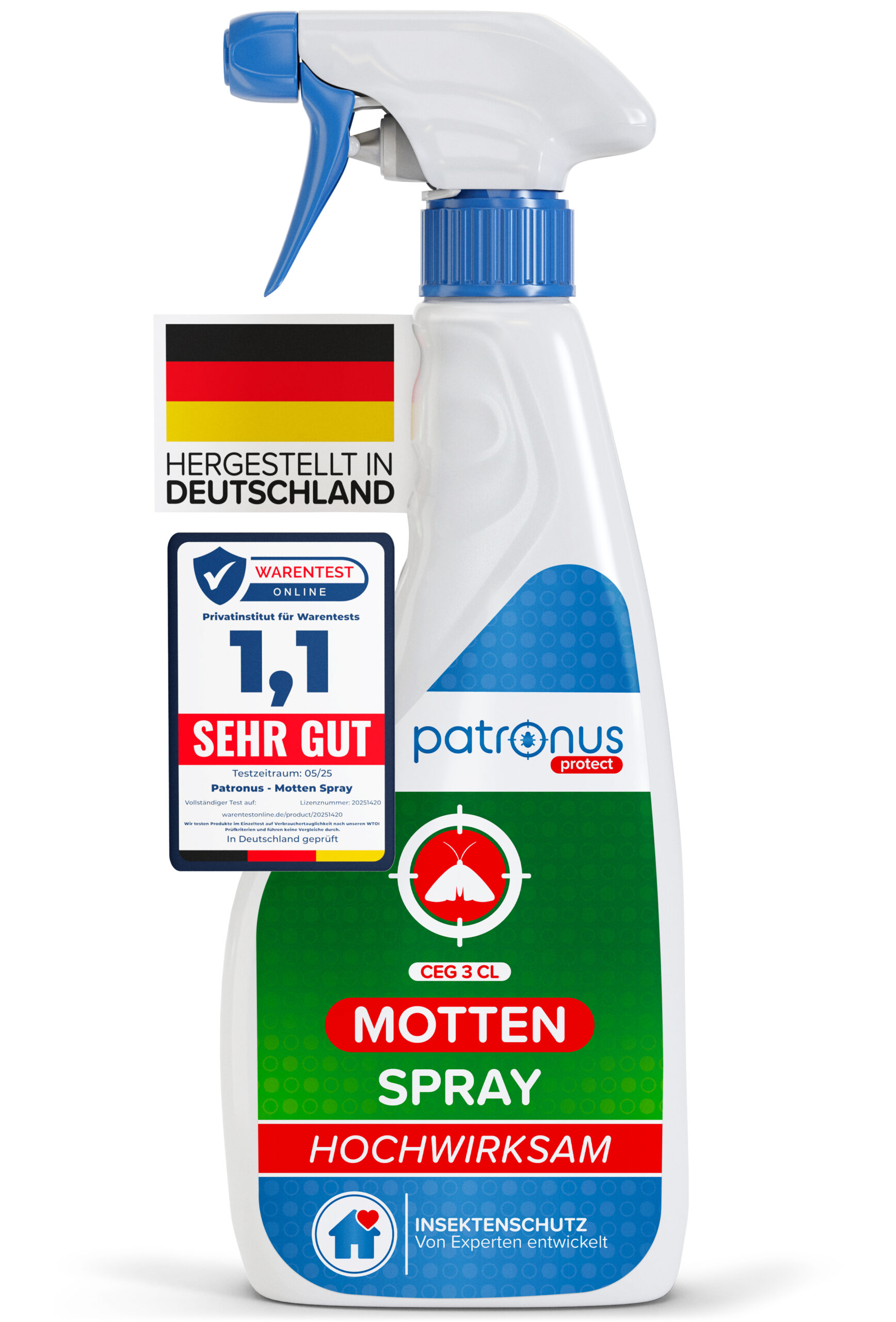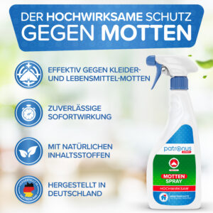 Als Bekämpfungsmaßnahme und Mottenschutz ist das Patronus-Mottenspray mit der besonderen Zusammensetzung eines der besten Anti-Motten-Mittel. Das Mottenspray ist einfach in der Anwendung, hochwirksam und dennoch sicher für Dich im Umgang. Bei einem sehr hartnäckigen Befall schafft das Power-Mottenschutzspray Abhilfe und sorgt für schnelle Ergebnisse.