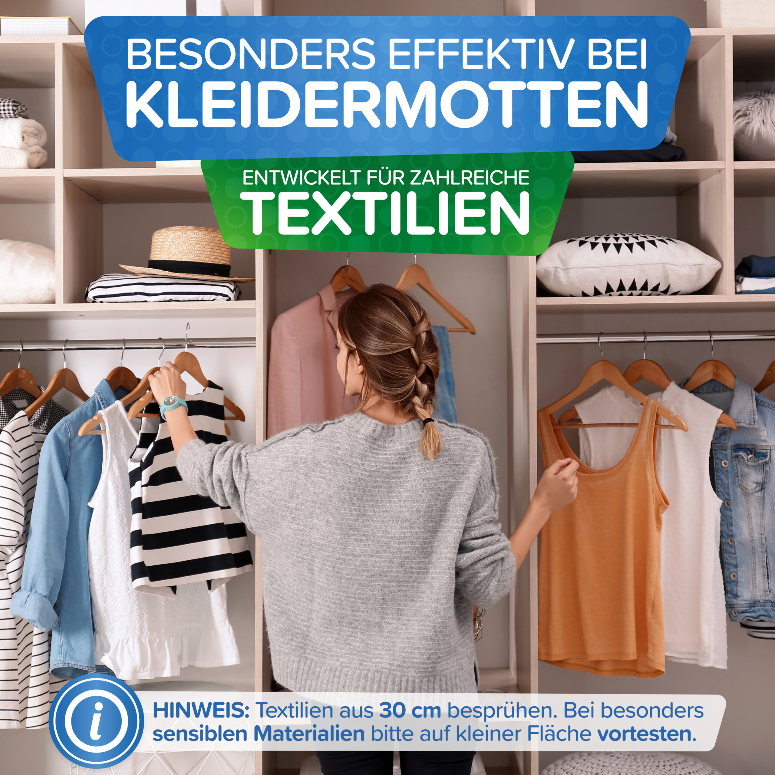 Wenn Du nach einer Sofort-Maßnahme gegen Motten suchst, dann ist unser Mottenspray genau das Richtige für Dich. Dank des Sprühkopfes lässt sich das Mottenspray mit einem feinen Nebel verteilen und landet selbst in noch so winzigen Spalten. Deshalb kannst Du Dir sicher sein, dass sogar das kleinste Mottenei von dem Mottenmittel erfasst wird. Nach dem Gebrauch wird der behandelte Raum nur noch ausgelüftet – fertig. Schnell und effizient hast Du die Mottenplage in den Griff bekommen.