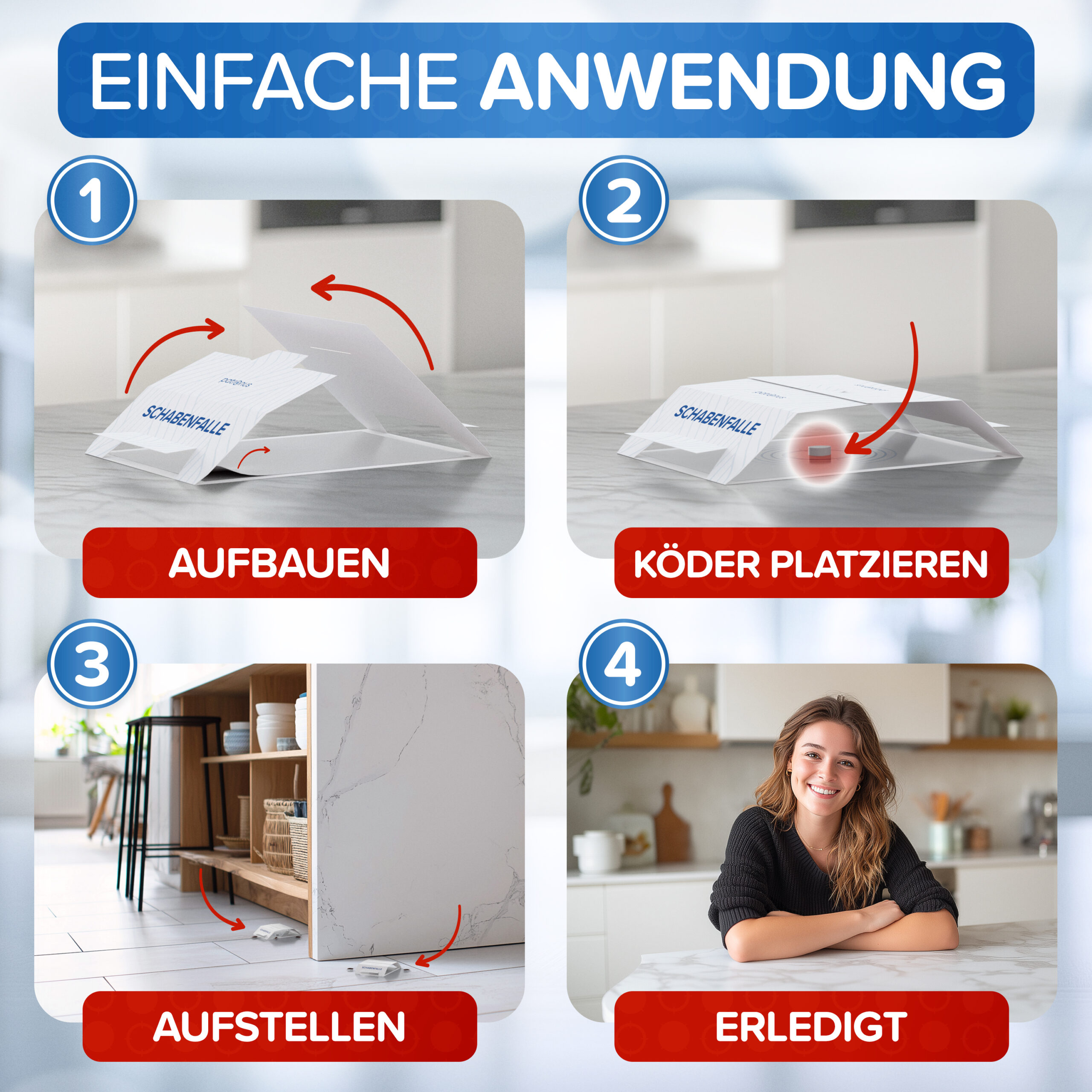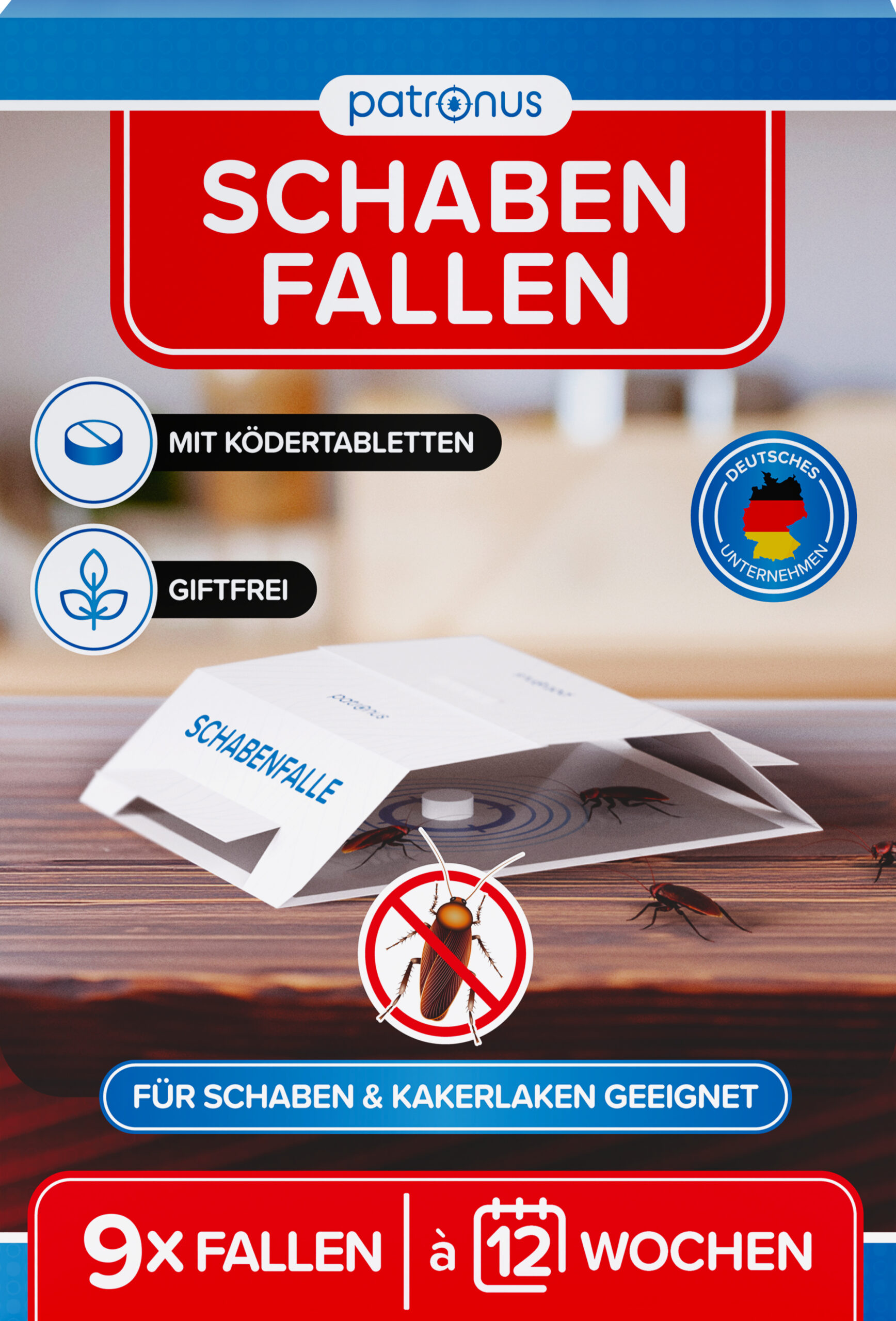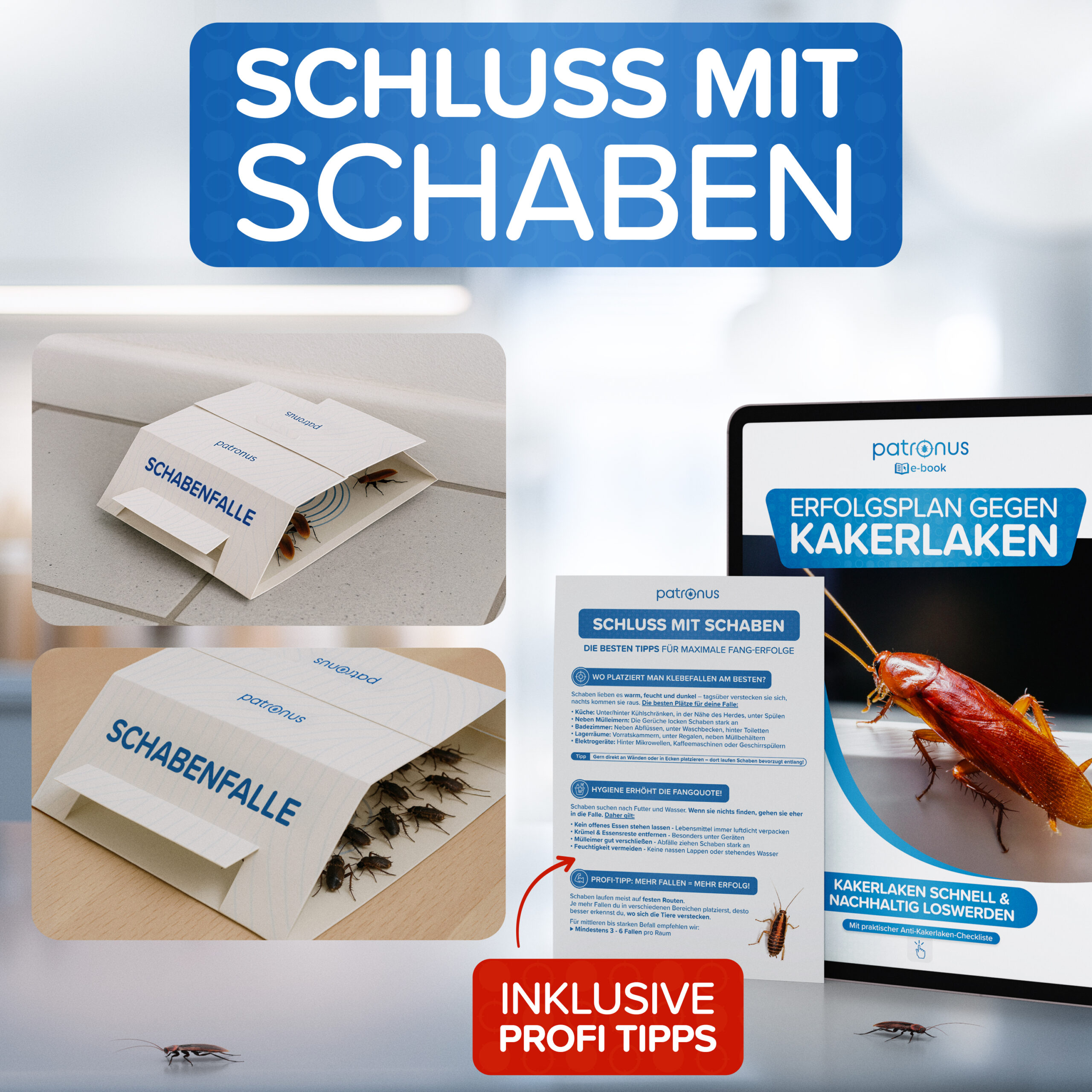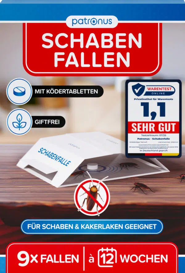 4. Schritt: Monitoring-Erfolg im Auge behalten – Fallen sind bis zu 12 Wochen wirksam. Wichtig: Wird ein akuter Befall mit Schaben festgestellt, empfehlen wir das Patronus Insekten-Spray (500ml oder 750ml) um schnellstmögliche Erfolge zu erzielen.